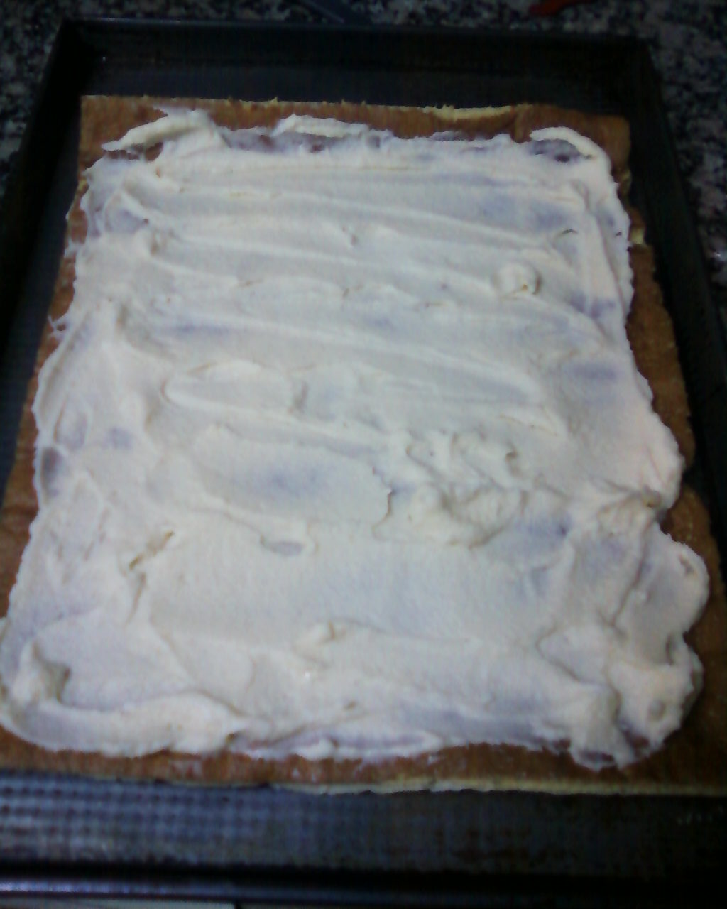 Partir en dos mitades el bizcochuelo, mojar una mitad con el líquido que soltaron las cerezas.